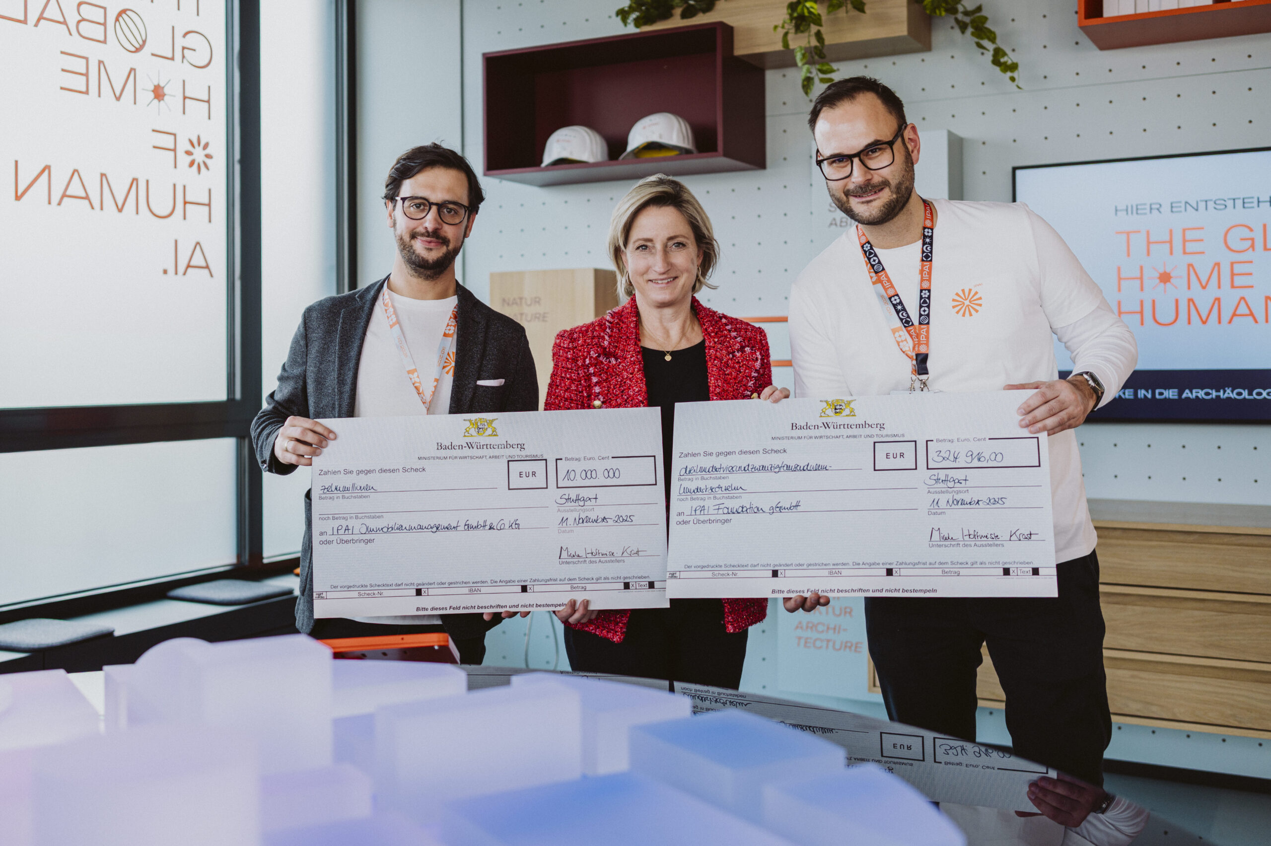 Im Rahmen des zweiten IPAI Experience Day in Heilbronn übergibt Dr. Nicole Hoffmeister-Kraut, Ministerin für Wirtschaft, Arbeit und Tourismus, heute (11. November) zwei Förderbescheide in Höhe von insgesamt rund 10,3 Millionen Euro an Moritz Gräter (CEO IPAI) und Dr. Benjamin Schiller (CFO IPAI). Mit zehn Millionen Euro wird die Errichtung des Start-up Innovation Centers auf dem 30 Hektar großen künftigen IPAI CAMPUS gefördert. Mit rund 325.000 Euro wird dar-über hinaus das Projekt „Women in AI“ unterstützt. Beide Förderungen sind Teil der 50 Millionen Euro, die das Land für die Realisierung des IPAI zur Verfügung stellt.